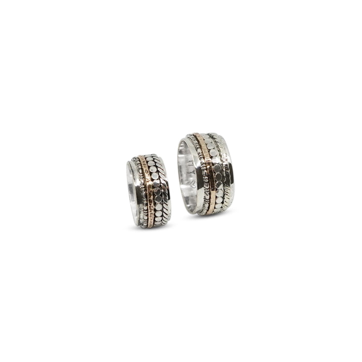 GEHAMERDE ZILVEREN RINGEN MET GOUDEN BANDJE Of je nu van klassiek houdt, van zilver of van goud; deze stapelring combineert...