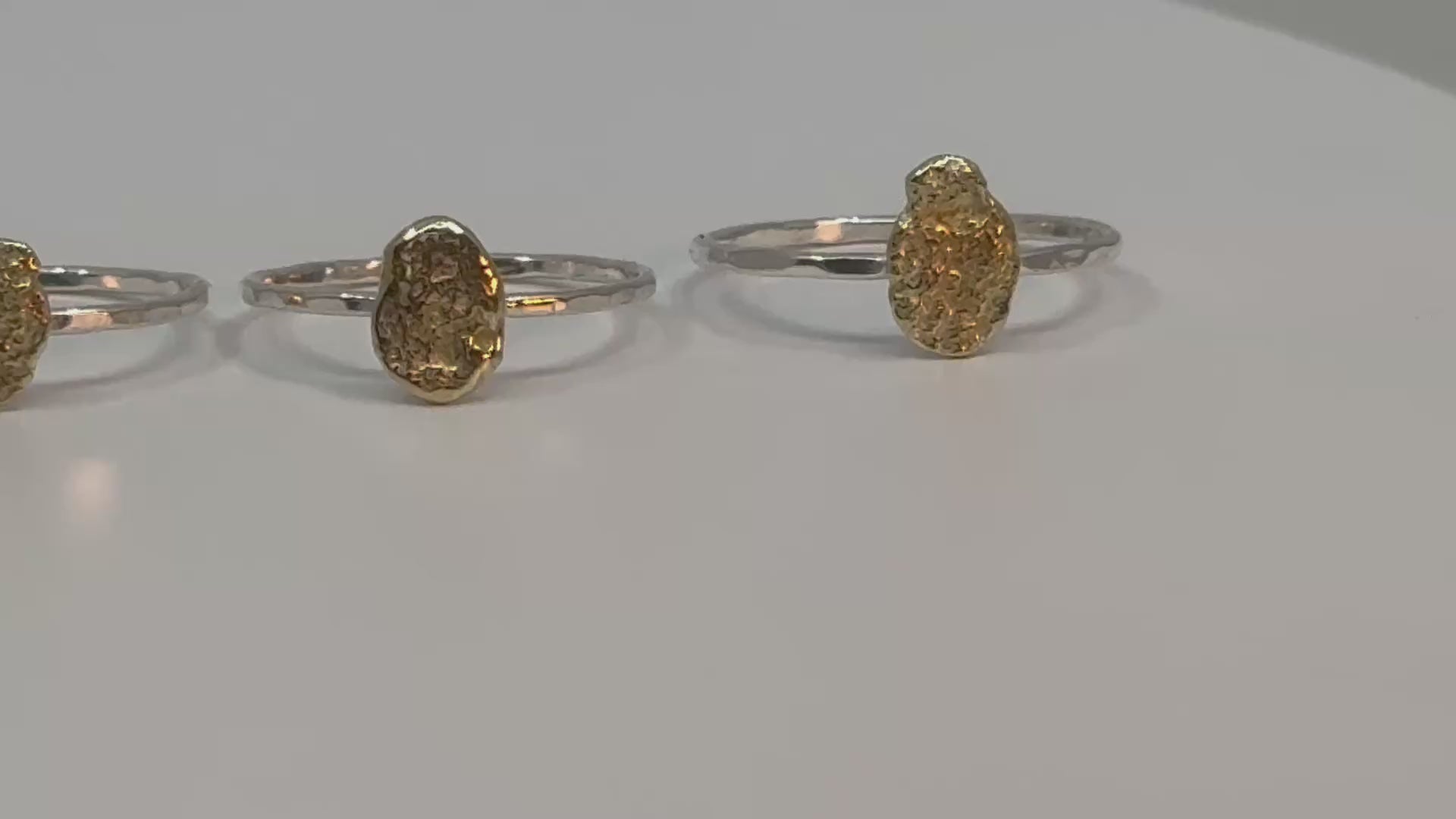 Deze smalle zilveren ringetjes met organisch gesmolten 14 karaat goud